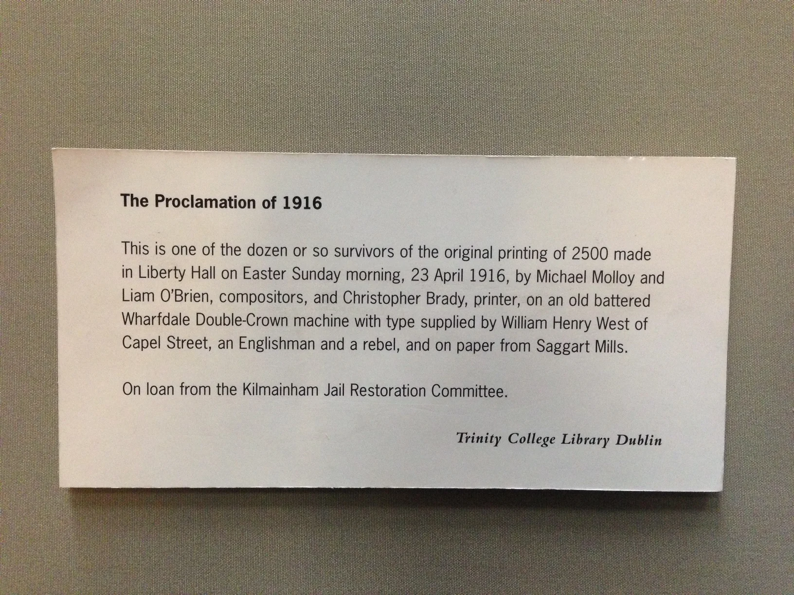 1916? 2017? This morning's early Saturday walk in Dublin to find the Book of Kells, was quickly overshadowed by the gravitas of the morning headlines from America and a poignant reminder in the Long Room of the Easter Rising and the age-old quest for Irish self-determination. Oppression, discrimination, and the necessity to get involved and help those at risk are issues confronting us all this morning. I stopped short at one of the few remaining copies of The Proclamation of 1916.